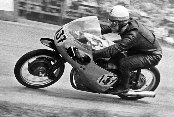 Sunday, May 4, 1958 in St Wendel, West Germany. The spark-plug lead of Hinton’s NSU Sportmax comes loose during the 250 race. He rolls to a stop, dismounts and uses the only available “tools” to strip the insulation material from the plug lead – his teeth.