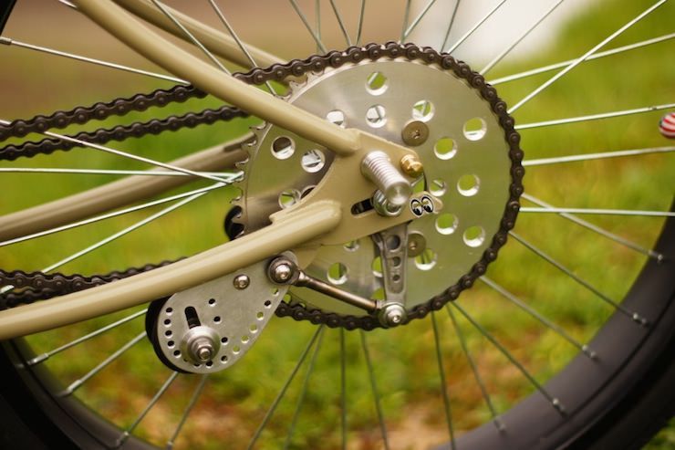 The drive system is a custom built and fully adjustable jack shaft set up for the rear wide tire. The front forks are rigid triple tree forks that have been sleeved. We had the frame powder coated with a custom color, and also made a custom aluminum tank for it.