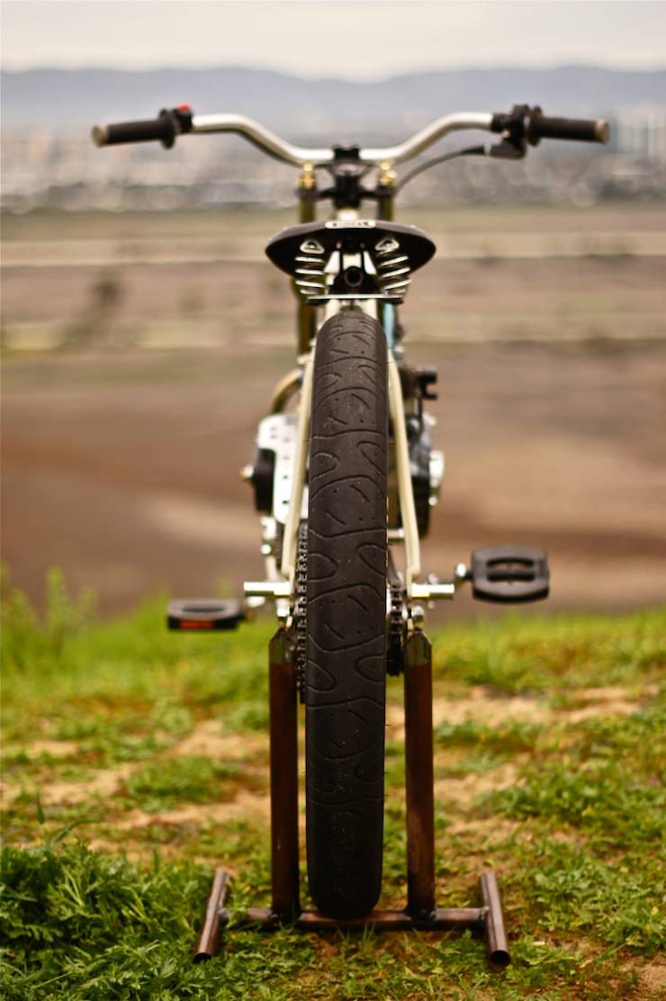 It started out as a commuter bike, that was until our friend from Venice Motorbikes threw in an extra wide back wheel, which required a chopped and widened tail section. This bike is powered by a 100cc 4 stroke with a hopped up cam, larger carb, and a custom exhaust.