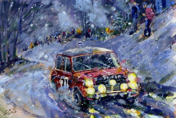 1965 Monte Carlo Rally, acrylic on paper 8” x 12″