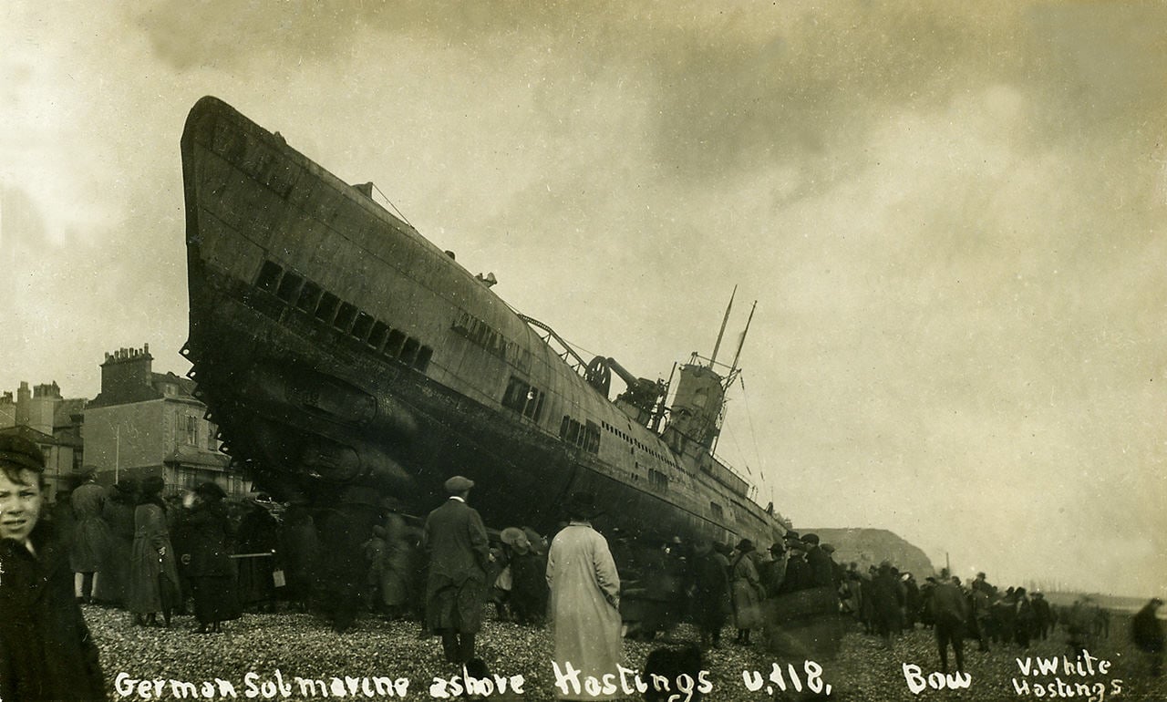 These extraordinary images were taken in 1919 on the beach at Hastings in Surrey, the submarine is a WWI model designated SM U-118 – she was being towed to France to be scrapped when the tow cable snapped during a storm. SM U-118 washed ashore right in front of the popular Queens Hotel and became an overnight sensation, drawing in tourists from all over England, Wales and Scotland.