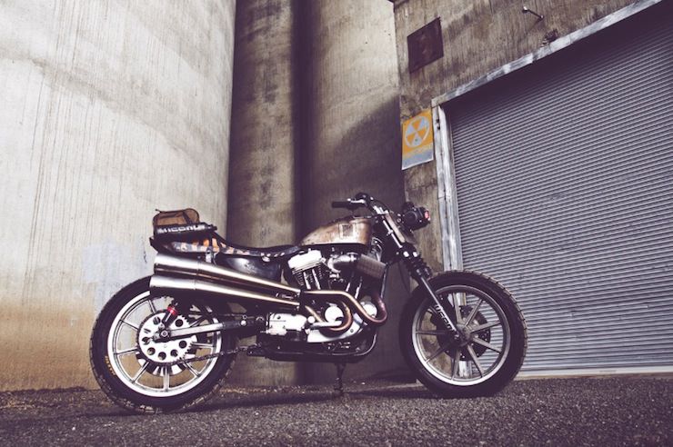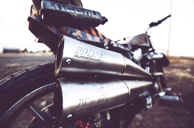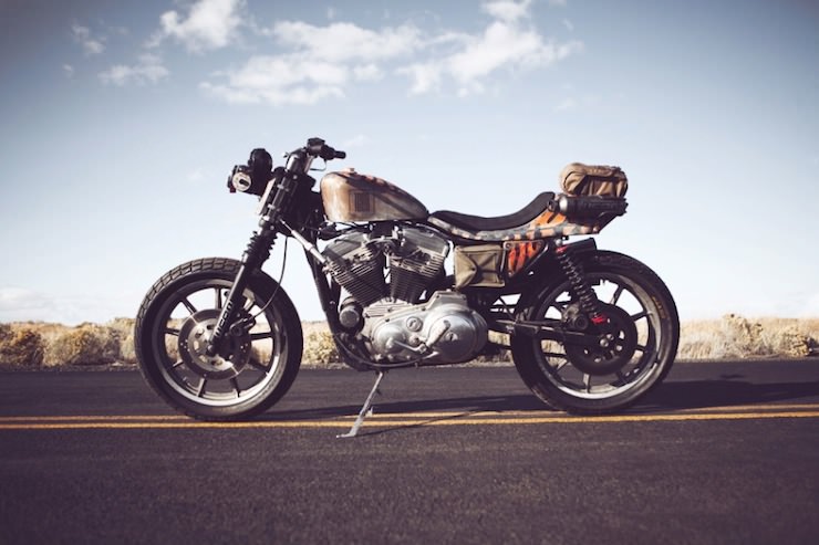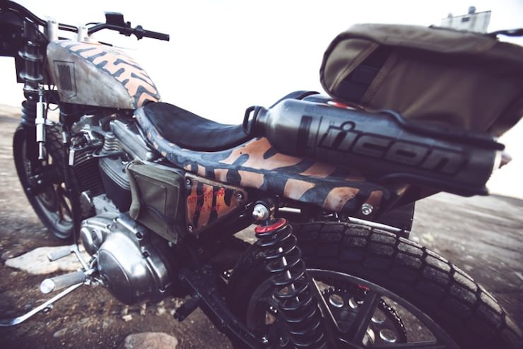 The Roach, as this bike is now called, started life as a stock 1986 Harley-Davidson Sportster. The Icon guys set about creating a v-twin dual-sport with a side of nuclear fallout, that 2 into 2 exhaust was custom made, the front forks were replaced, the rear suspension was swapped out to giver her a little more ride height.