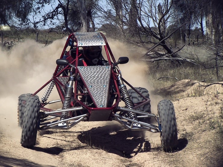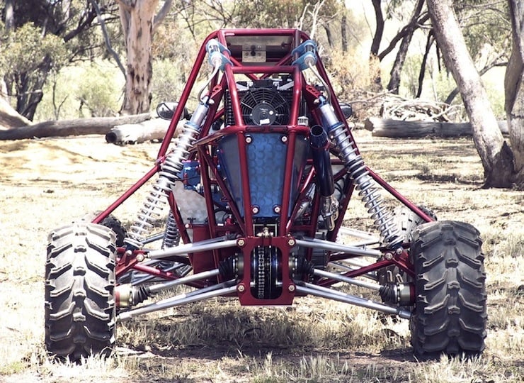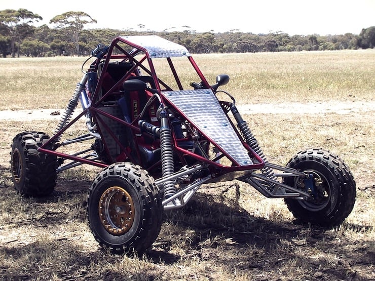 Most people who build this buggy choose a 600cc to 1400cc superbike engine with the Suzuki Hayabusa engine being the most popular choice. The original transmission is kept and the chain drive runs directly to the rear wheel drive assembly, the completed Barracuda weighs in at ~380kgs so as you can imagine, the off-road performance is a little on the brisk side.