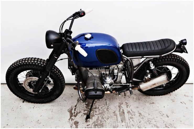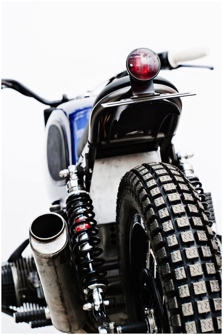 And so they set about finding a suitable donor bike, then they carefully removed the fairing before disassembling the bike completely. The frame was detabbed and painted and then engine was re-fitted after it had been rebuilt and retuned to run with the new K&N air filters, a fuel tank from a BMW R80/6 was sourced and painted electric blue and a new seat was made bespoke.