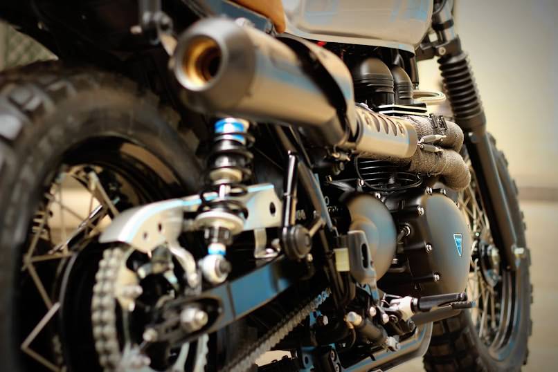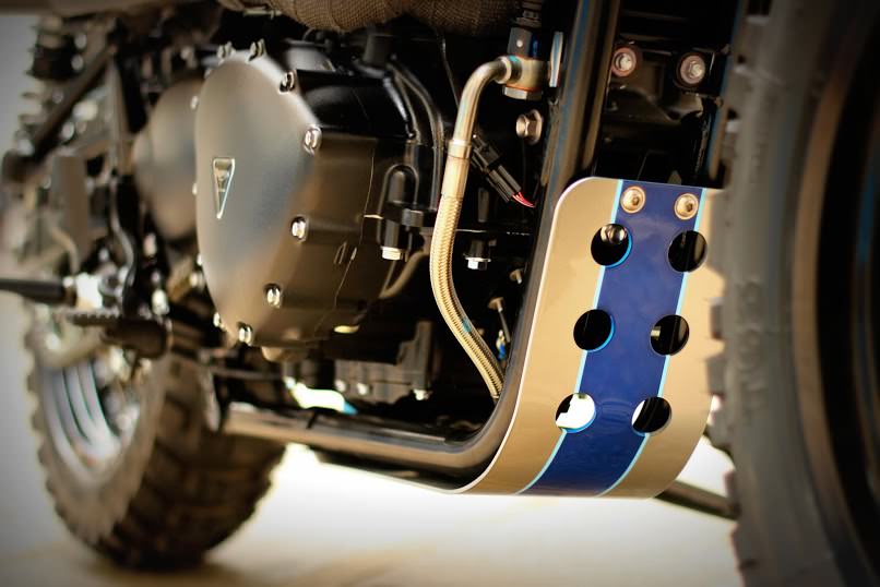 The Cafe-Tracker is sitting on Excel rims front and back, it’s fitted with am Arrow exhaust 2 into 1 with black ceramic coating and heat wrap, that fuel cap is a classic Monza design, the suspension is Ohlins and that skid plate is drilled aluminium.