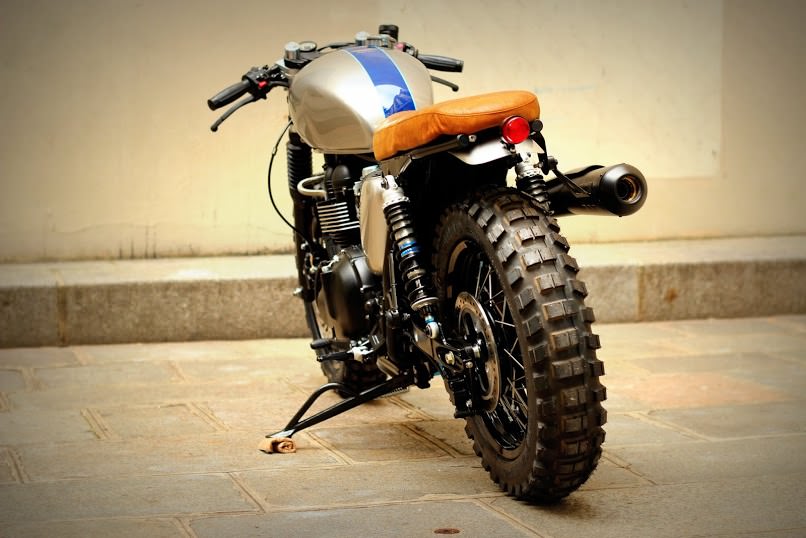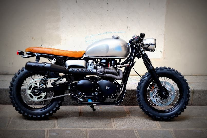 This beautiful Triumph cafe racer/dirt tracker is the most recent creation from Vintage Racers, a Paris based motorcycle club, blog and garage. The first impression the bike gives you is that it’s ready to cross the Maginot Line and invade Germany with its twin exhaust pipes blazing, the chunky tires and meshed headlight give the Triumph a look so gruff that I suspect other motorcycles would cross the street to avoid making eye contact with it.