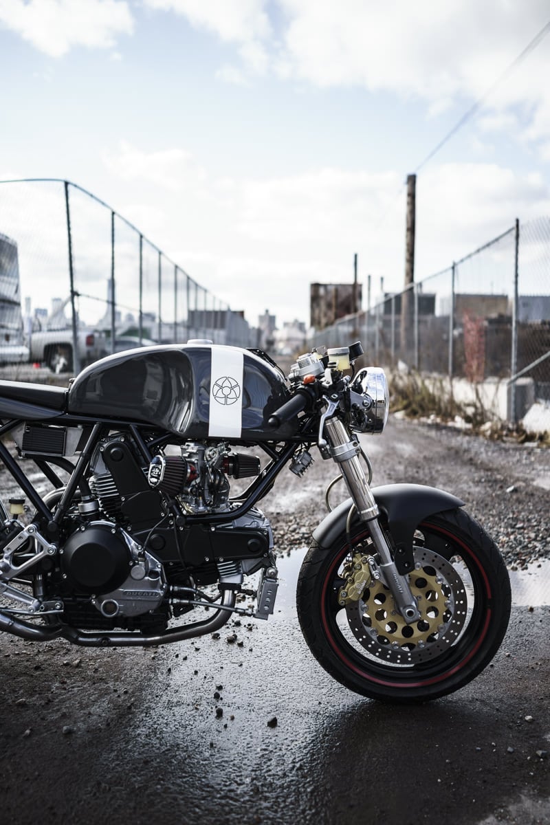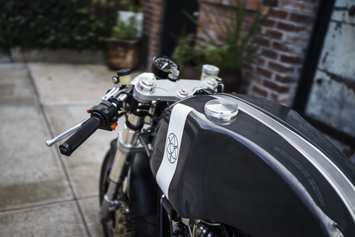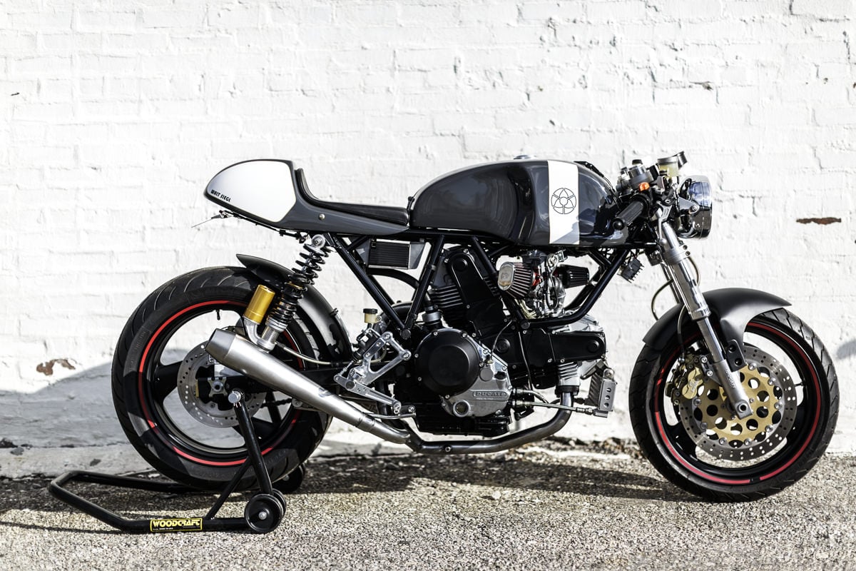 The Leggero is based around a Ducati 2 valve 900cc v-twin fitted with 39mm Keihin carburettors, the frame is a CAD developed chromium-molybendium unit that weighs in at just 19lbs and the tank/bodywork are made from hand-laid carbon fibre. Suspension is provided by Showa up front and Öhlins at the rear giving the bike some serious track potential for those wanting to do more than park it outside the local coffee co-op.