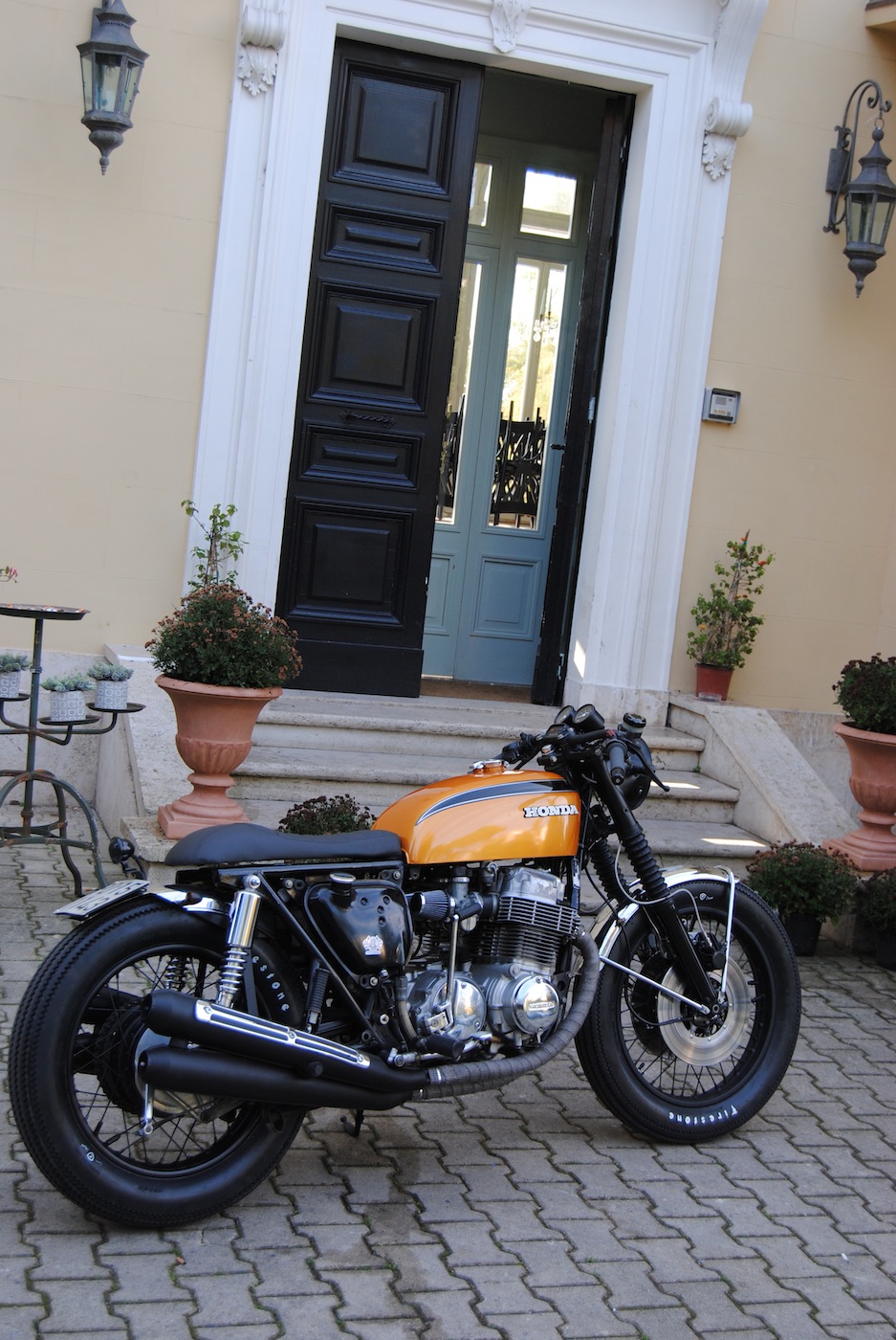 Ottodrom is a new custom brand in Rome. Paolo "Corto Maltese", the man behind this brand, is passionate of vintage bikes. Like many of the the Toman riders of the early eighties, he started riding on a CB350 four and, since then, he never stopped. He eventually owned several BMW K100 and became a fan of the German brand. His workshop opened six months ago and a shop in Rome is expected in the near future. These two golden sisters, two of the earlyCB 750 and CB500 Four are some of his first builds. Good luck!