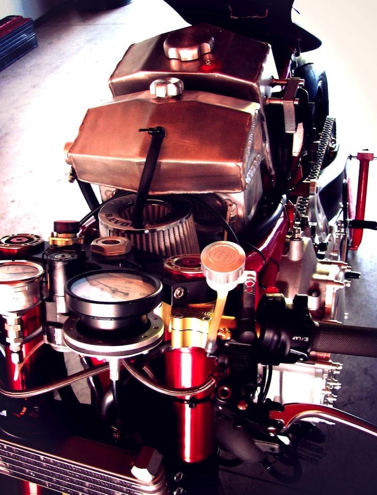 The engine dominates the design, appearing massive in relation the other components. The swingarm is quite long relative to the rest of the machine, and pivots high in the engine cases by necessity – the countershaft sprocket sits at knee level due to the placement of the gearbox on top of the engine. The result looks like a strange amalgam that appears incongruous but purposeful – it looks like someone stuffed a GSXR-1100 engine into a dirtbike chassis. The hidden frame and minimal bodywork contributes to this all-motor appearance, as does the tiny tailsection and seat perched high above the rear wheel. Some make comparisons to café-racers, but I’d be more inclined to describe it as a brutish hand-built streetfighter.