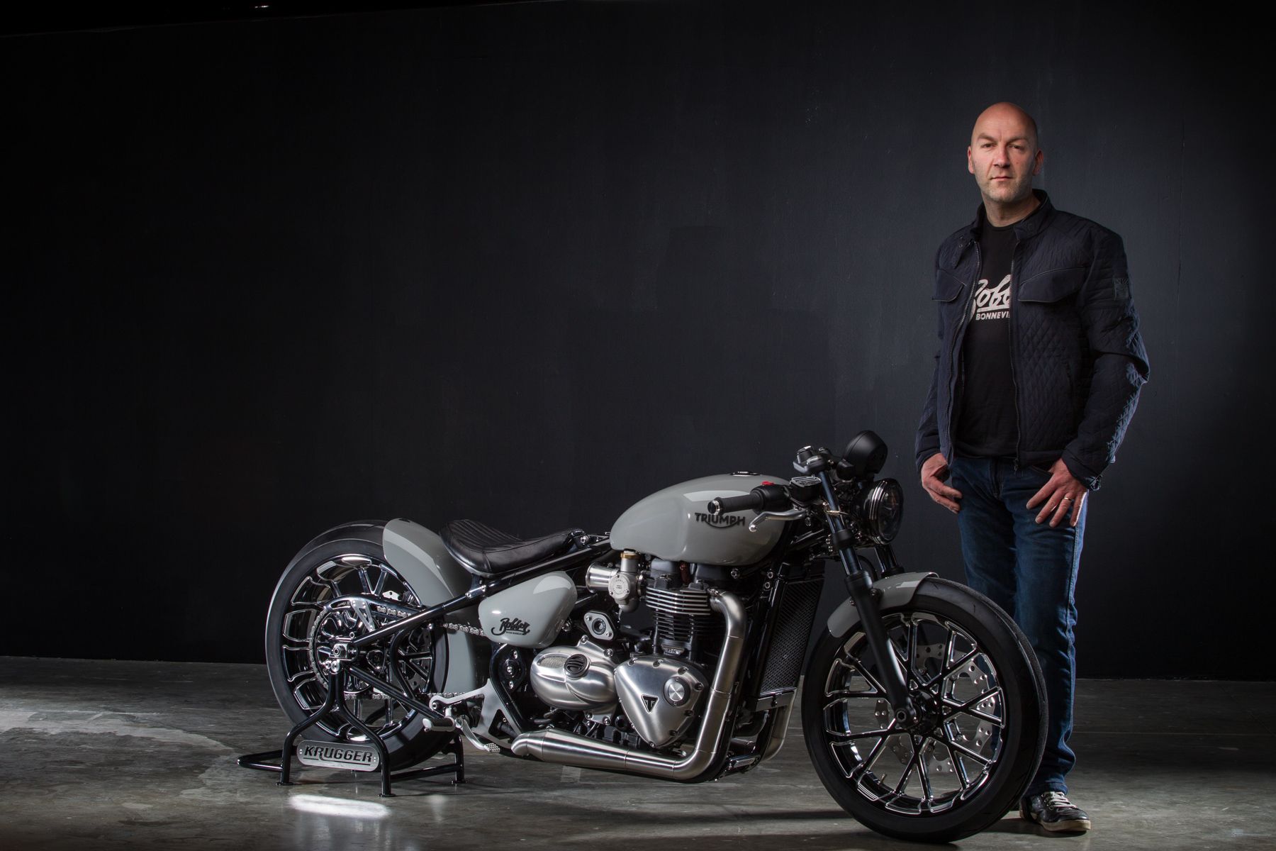 C'est une personnalité mondialement connue qui s'annonce au départ des Legend Boucles @ Bastogne 2019 ! Pas question de pilote issu du World Rally Championship ou de la F1, mais bien de 'Krugger' en personne, dont les réalisations très personnelles sur deux et quatre roues, dans la catégorie 'Custom', ont depuis longtemps défrayé la chronique. Fred Bertrand - de son vrai nom - s'est d'abord adonné à la compétition moto et auto, se distinguant notamment par un style très acrobatique en rallye ! C'est en 2000 qui décidait d'inaugurer son atelier de transformation, du côté de sa patrie, Basse-Bodeux. Trois ans plus tard naissait 'Maywood', avec les premières récompenses internationales à la clef, superbe custom moto qui sera suivi de 'Hotclimbing', 'Cad 22', 'Speedbowl' et bien d'autres. En moins de 20 ans, 'Krugger' a fait la Une de tous les magazines spécialisés... tout en restant le gars sympa de Basse-Bodeux qu'on a toujours connu. Avec 'Rebellion', il s'est même attaqué au hot-rod en 2015, avant d'imaginer une nouvelle machine hors-normes pour le compte de Triumph (voir photo).