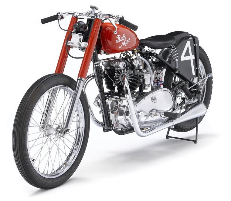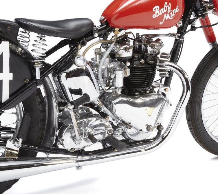 Baby Mine is a highly tuned drag racing motorcycle built and ridden by teenage drag racing sensation Bobby Sirkegian. Sirkegian started racing at the age of 13 in the early 1950s, he became a household name when the popular television programme ”You Asked For It” featured him in 1954, racing his Triumph against all comers on a number of Southern Californian quarter-mile dragstrips.